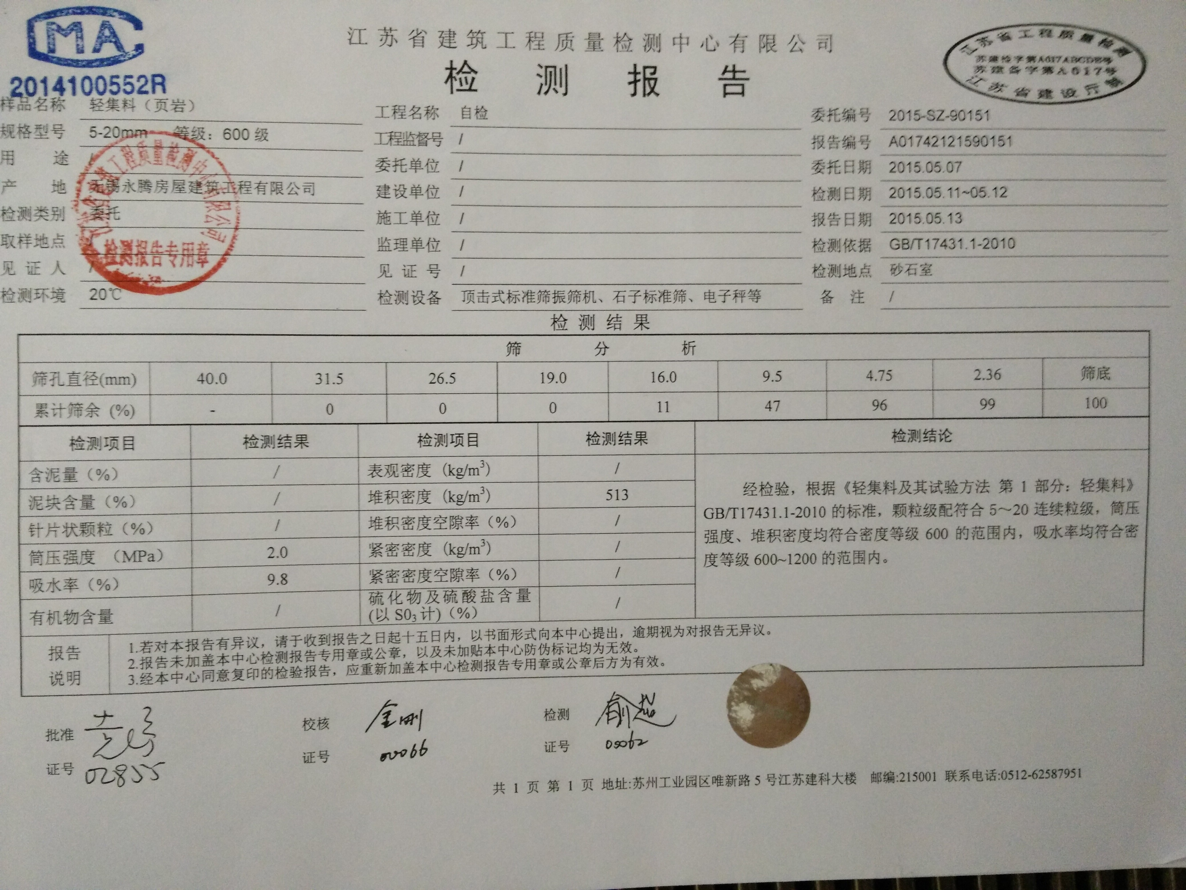 輕骨料混凝土原材料檢測報告